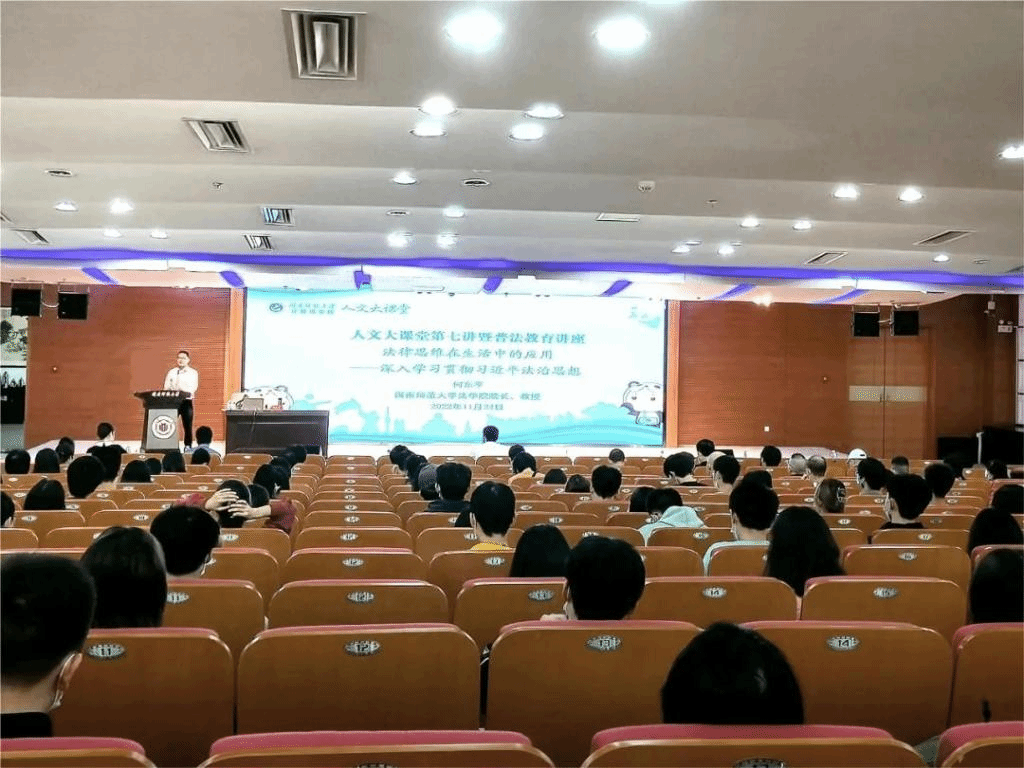 为深入学习贯彻习近平法治思想,增强学院师生法治意识和法律思维能力,11月24日下午,太阳成集团tyc522cc人文大课堂第七讲于逸夫图书馆五楼报告厅正式开讲,tyc522cc太阳成集团法学院院长何东平教授受邀主讲,学院党委副书记陈小玲主持。