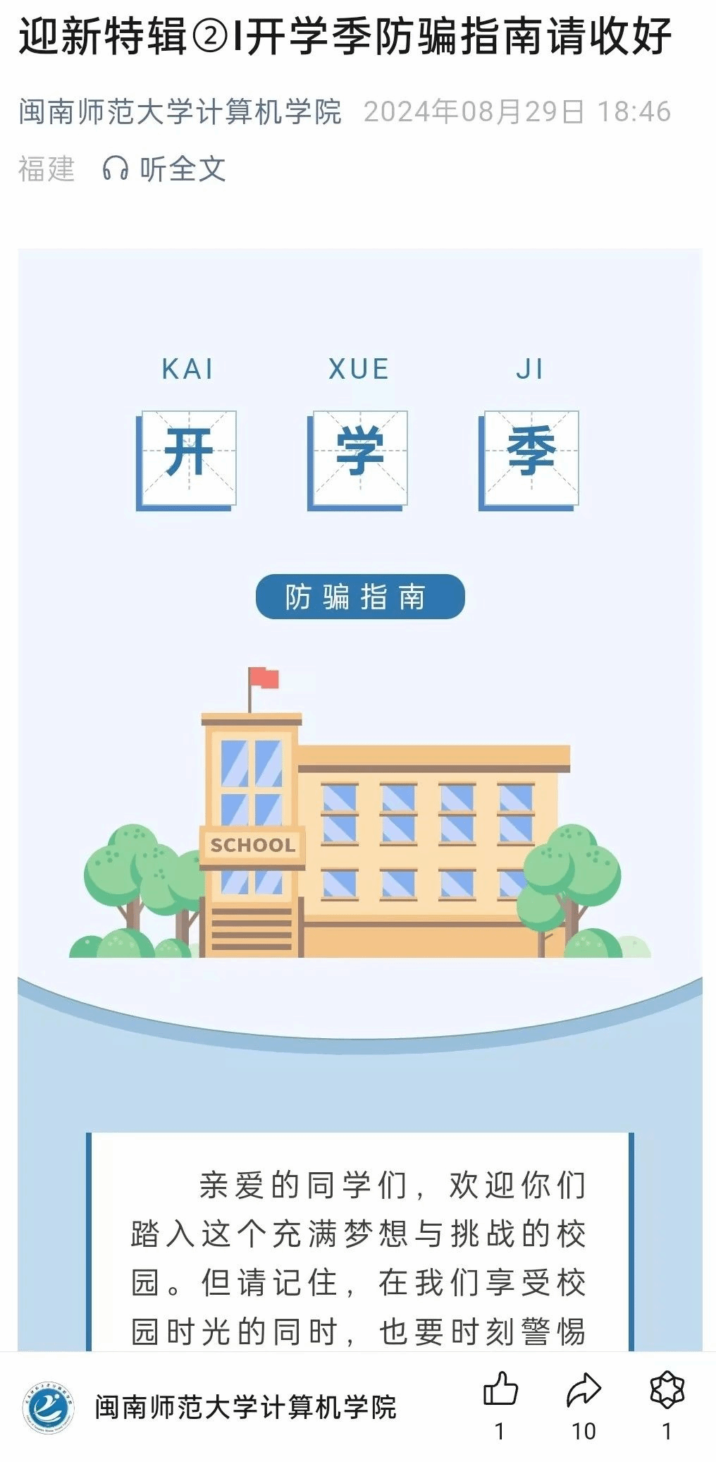 同时,学院利用微信公众平台开展了系列反诈防骗宣传教育,帮助各年级同学在开学季这个电信诈骗高发季中保护好自己的财产安全。
