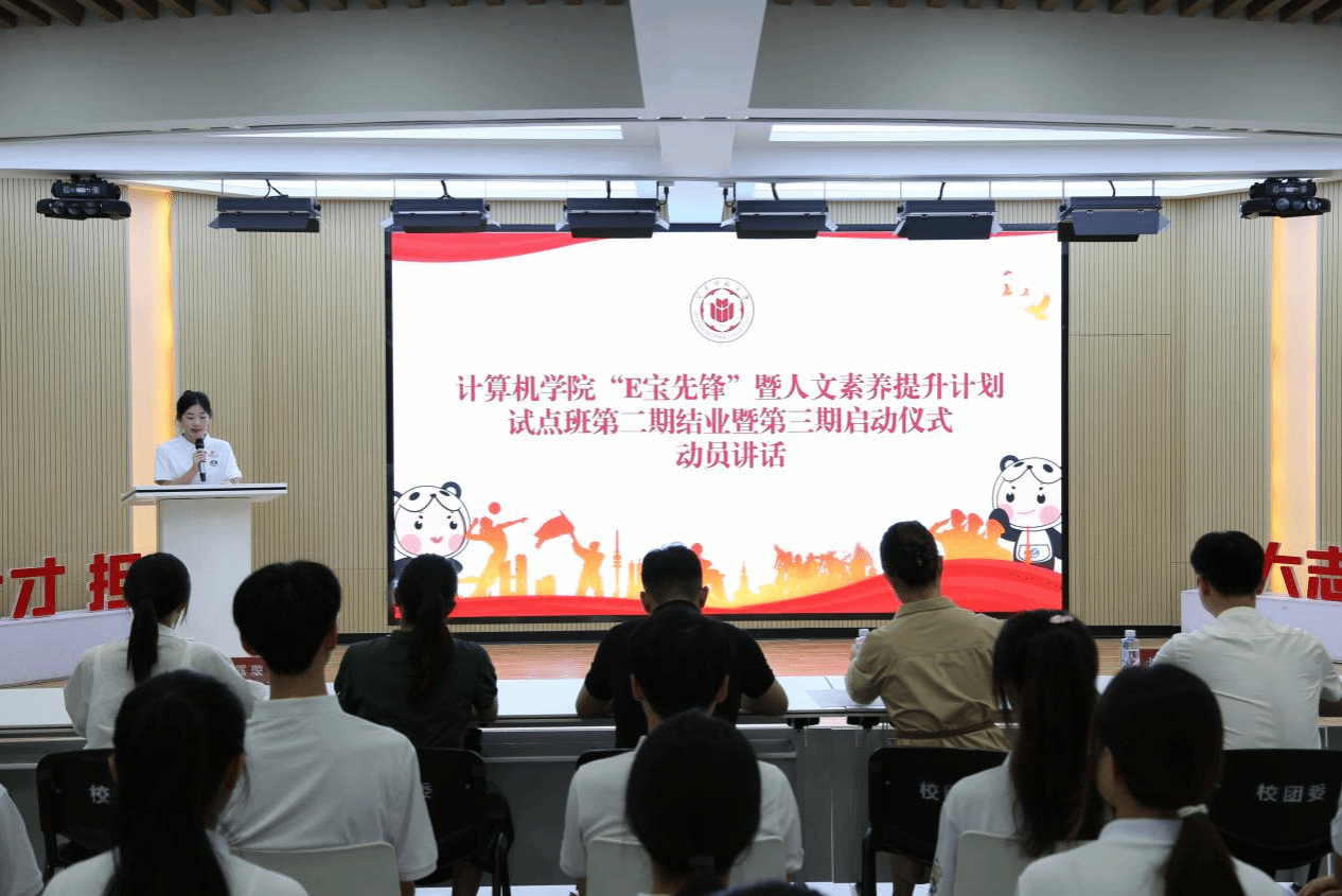 最后,学院党委副书记陈老师作动员讲话,并对全体学员提出了三点希望:一是保持“E宝先锋班”的特色,兼顾科技与人文,实现跨学科学习,既深耕计算机科学,又广泛涉猎人文社科,促进全面发展;二是明确身份和责任,扮演好学生和学生干部的双重角色,将学习作为信仰,锤炼品格,练就过硬本领,发挥模范带头作用;三是充分利用“E宝先锋班”平台,主动锻炼,勇于创新,追求卓越,不断提升和完善自我。