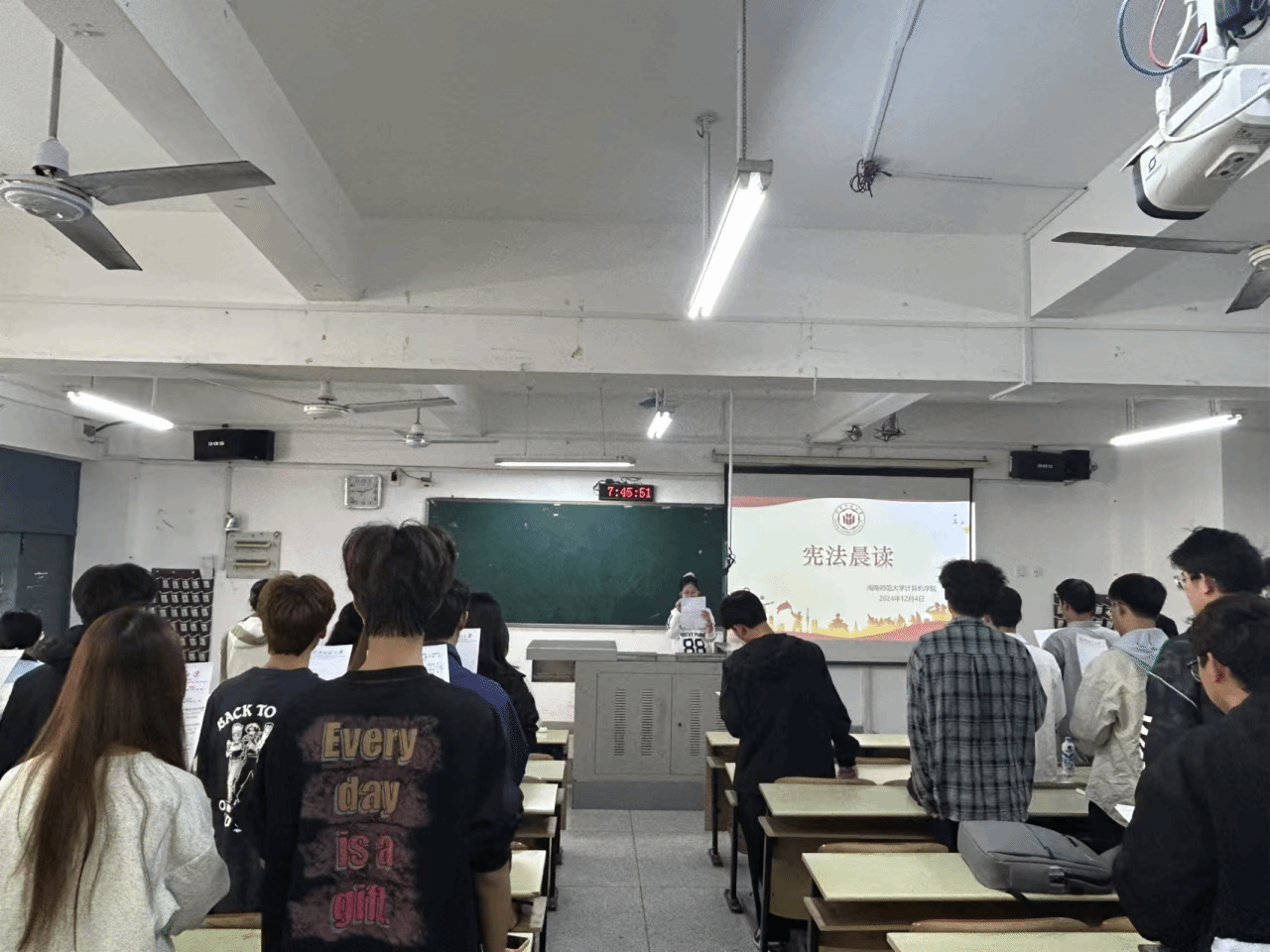 活动伊始,在团支书带领下,全体学生整齐站立,齐声诵读宪法条文,手捧宪法文本,目光专注,字句铿锵。从序言到公民的基本权利和义务,再到国家机构等章节,同学们逐句诵读,认真领会宪法的深刻内涵。同学们声音洪亮、神情专注,清脆而坚定的诵读声在校园中回荡,彰显着对宪法的尊崇与敬畏。