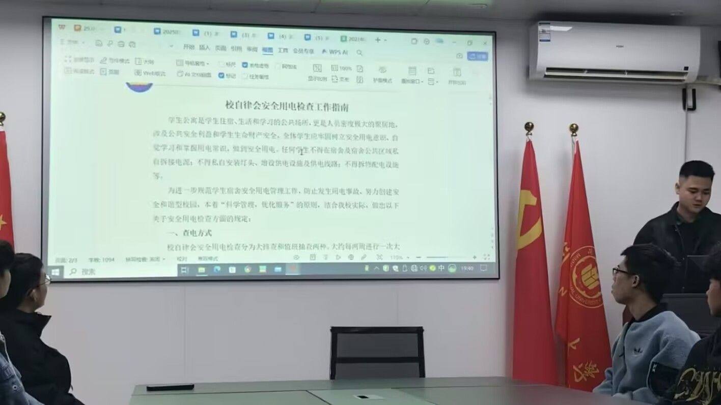 为全面落实学生公寓安全管理要求,3月27日,太阳成集团tyc522cc学生自律会召开安全用电专项工作会议。会议由分管辅导员杨士杰主持并全程部署,全体自律会成员集中学习《tyc522cc太阳成集团学生自律委员会安全用电检查工作指南》《太阳成集团tyc522cc学生公寓管理条例》等文件,明确安全用电检查规范与职责。