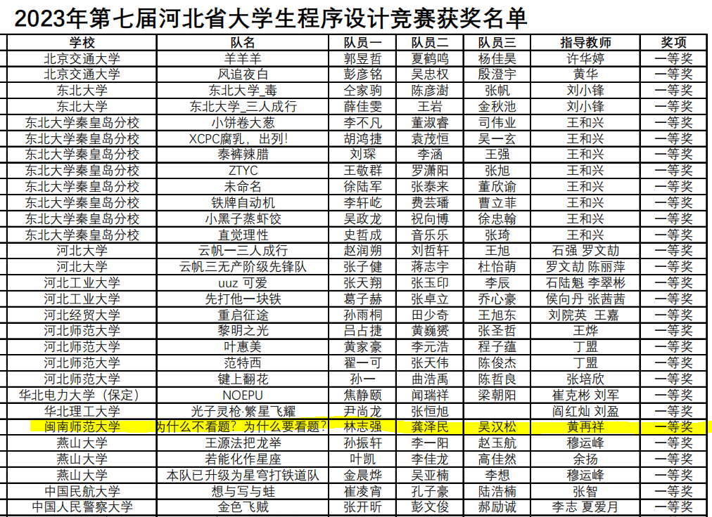 2023年5月20日-21日,第七届河北省大学生程序设计竞赛在东北大学秦皇岛分校圆满落下帷幕。此次比赛共有来自北京交通大学、东北大学、华北电力大学、燕山大学等55所省内外院校的261支队伍同台竞技。由20级计算机科学与技术专业吴汉松、林志强、龚泽民组成的代表队经过5小时的角逐,最终获得一等奖。