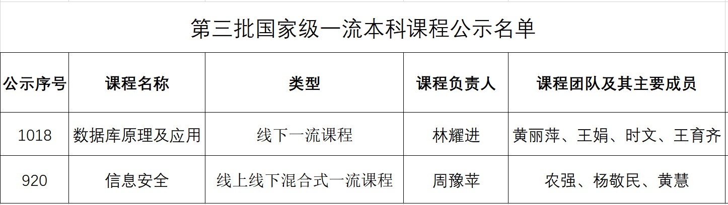 近日,教育部高等教育司发布了《关于第三批国家级一流本科课程认定结果的公示》,我院林耀进教授负责的线下课程《数据库原理及应用》和周豫苹教授负责的线上线下混合课程《信息安全》入选国家级一流本科课程。
