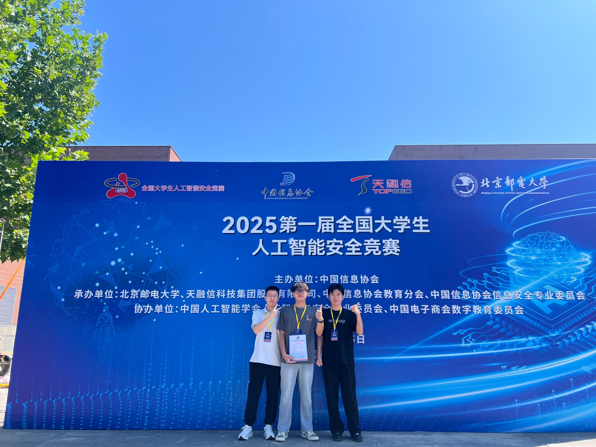 2025年8月25日,由中国信息协会主办,北京邮电大学网络空间安全学院、天融信科技集团、中国信息协会教育分会、中国信息协会信息安全专业委员会承办的2025第一届全国大学生人工智能安全竞赛决赛在北京邮电大学圆满落幕。我院王育齐教授带领的参赛队伍(22级软件1班廖开富、23级软件1班郭竹行、23级软件2班陈凌宇和23级大数据班俞果),在决赛中凭借着扎实的专业知识和出色的临场发挥取得佳绩,其参赛作品《像素级双重守护:智能去痕与干扰免疫系统》荣获全国二等奖。
