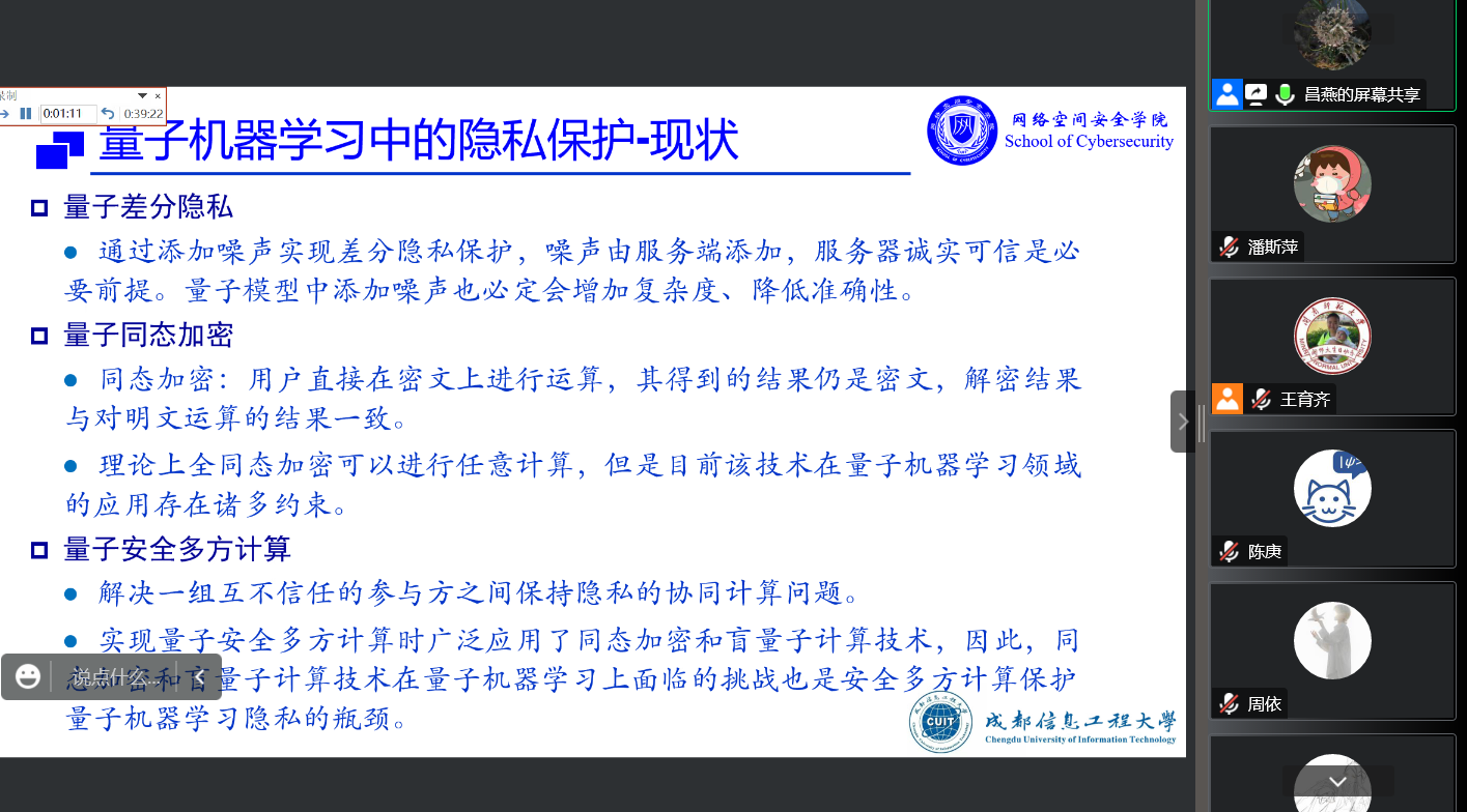 11月21日晚上,成都信息工程大学网络空间安全学院副院长昌燕教授应邀为我院师生做线上专题报告,报告题目为“量子机器学习中的安全问题”。本次报告由学院王育齐副教授主持。