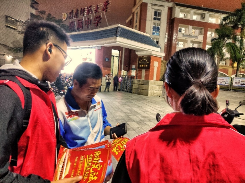 党员们向群众分发普法、四中全会宣传材料