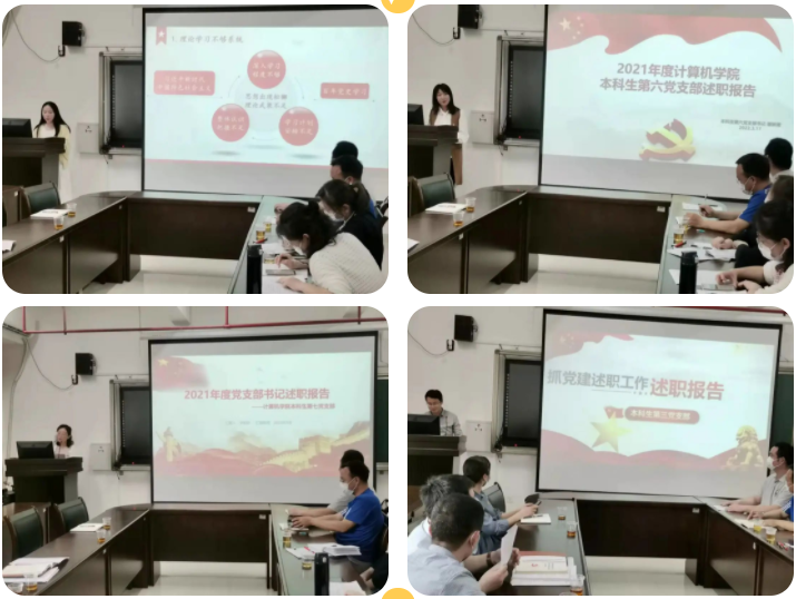 祁超代表学院党委作点评并讲话。他指出,过去的一年,我院各党支部书记担当务实,认真履行抓太阳集团责任,着力抓规范、补短板、创特色,扎实推进党建与思政、党建与事业发展融合共进,取得显著成效。祁超强调,2022年是党的二十大召开之年,也是学校的“提质增效行动年”,抓好新一年的党建各项工作意义重大。各支部书记切实增强历史使命感和工作责任感,继续肩扛责任再出发,认真落实《中国共产党党支部工作条例(试行)》,完善工作思路,强化问题导向,抓好问题整改,推动党支部建设全面提质增效。一是要进一步把加强思想政治建设与强化行为示范引领结合起来,持之以恒加强习近平新时代中国特色社会主义思想学习,着力提升党员理论素养、党性修养和服从大局的水平,加大示范引领力度,引导教师党员争做教书育人的模范、学生党员争做成长成才的榜样;二是要进一步把完成规定动作与创新自选动作结合起来,严格落实“三会一课”、主题党日活动,立足各支部人员结构和计算机专业特点,创新支部组织生活的形式和内容,激发支部活动内生动力和创新活力;三是要进一步把支委分工与集体协作结合起来,充分发挥支部委员的主动性,建立健全支部委员工作职责清单,注重发挥党员各自所长,坚持重大工作集体协作的优良传统,切实把支部班子建好建强。