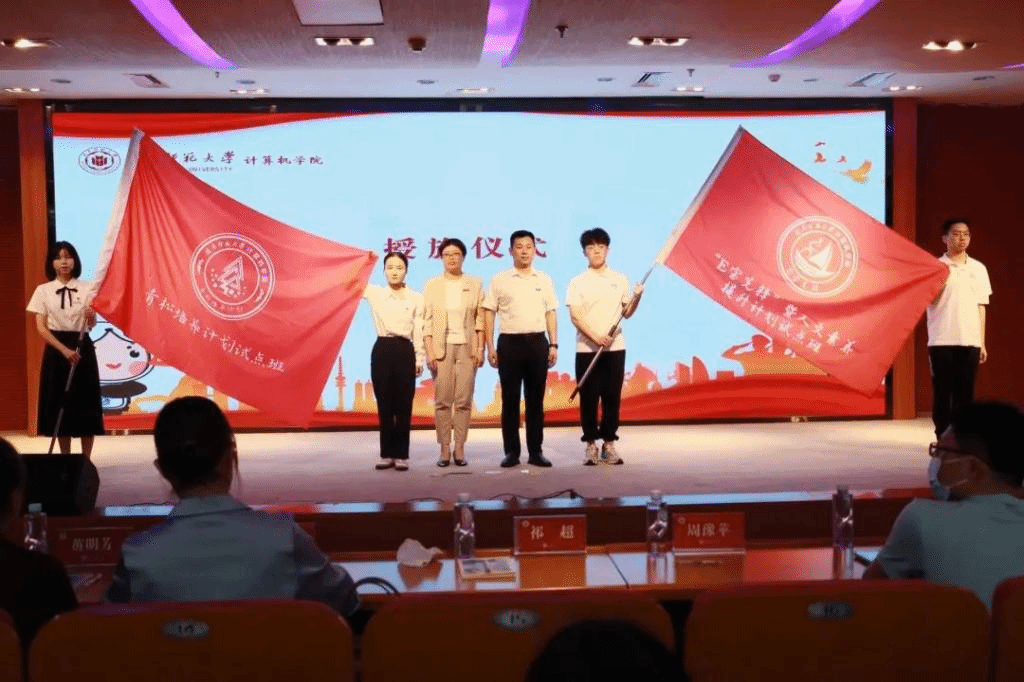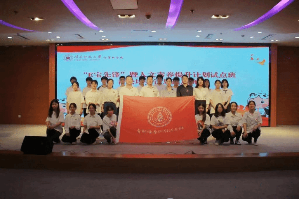 学院党委书记祁超、副院长周豫苹分别为E宝先锋班、青松培养班授旗。