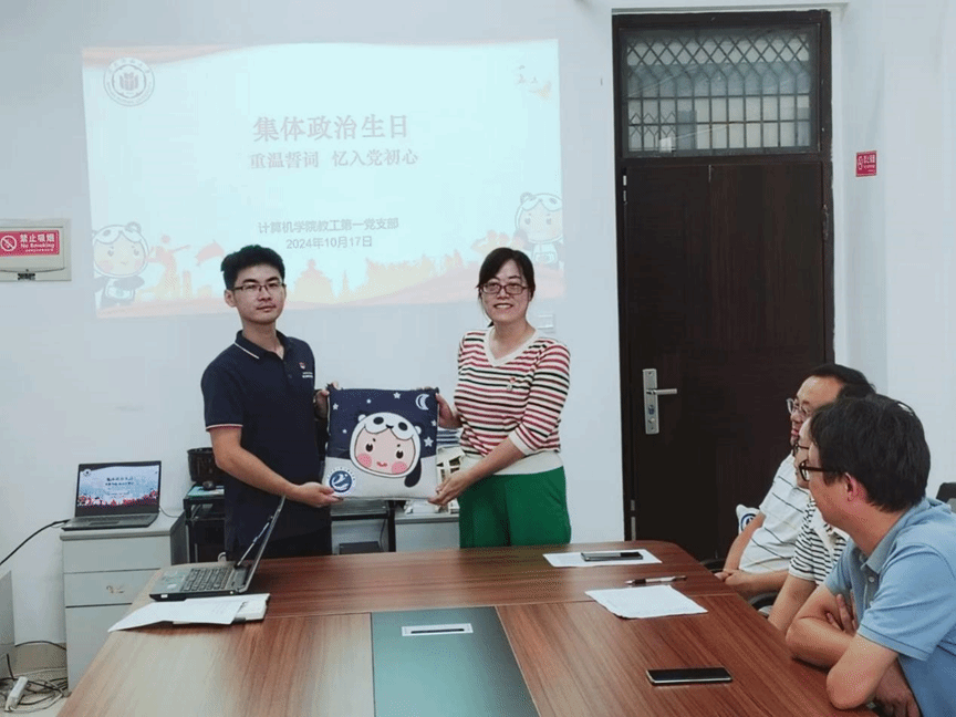 随后,党支部开展集体政治生日主题活动。活动中,党支部书记带领支部成员重温入党誓词,回顾政治生涯,激励前行步伐,并赠送学院文创产品“党e宝抱枕”。