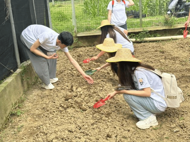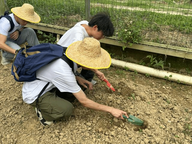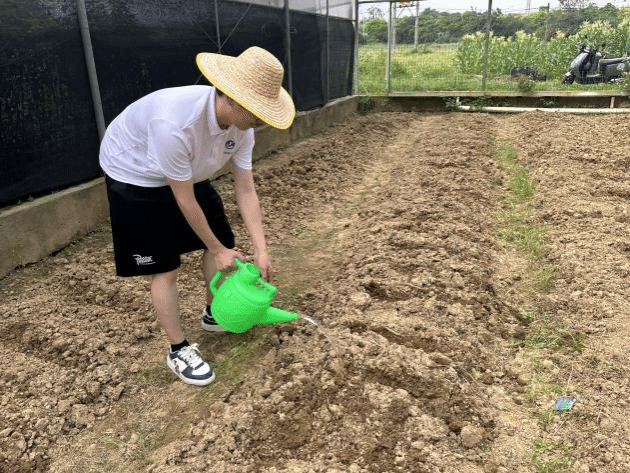 学员们头戴草帽,手持农具,俯身于土地,播种、浇水、撒草木灰。