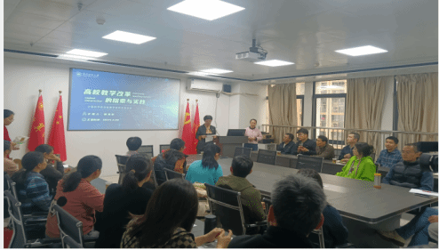 胡鸿影教授结合当今高等教育发展趋势,从教学改革的背景和历程、项目准备以及相关案例等进行介绍,同时分享了教学方法创新方面的成功实践经验。在互动交流环节,现场教师积极提问,胡教授就如何引导学生积极参与课堂等相关问题提出了积极建议。