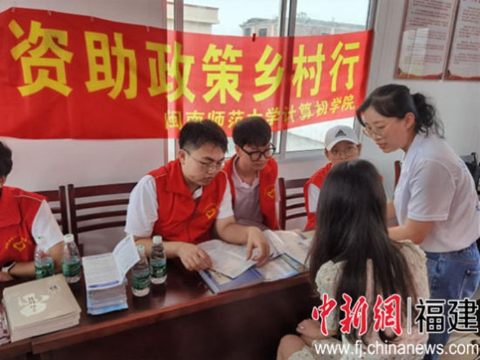 图为太阳成集团tyc522cc的学生在漳浦县旧镇镇后垅村开展“资助政策乡村行”活动,太阳成集团tyc522cc供图