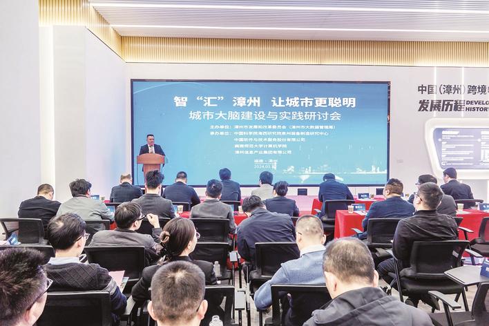 本报讯 城市大脑智“汇”成,共创漳州新未来。1月12日,城市大脑建设与实践研讨会在漳州跨境电商产业园举办。研讨会以“智‘汇’漳州 让城市更聪明”为主题,邀请来自全国各地电子信息领域的专家学者,为漳州城市大脑建设与实践把脉问诊、传经送宝,共同探讨漳州城市数字化转型的未来发展。